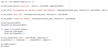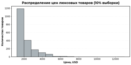 Все графики были оформлены в едином стиле с ограниченной цветовой палитрой и шрифтом Montserrat Bold. В результате удалось показать как изучающий, так и объясняющий анализ данных и сделать вывод, что выбросы в датасете связаны с реальным присутствием люксовых товаров.
