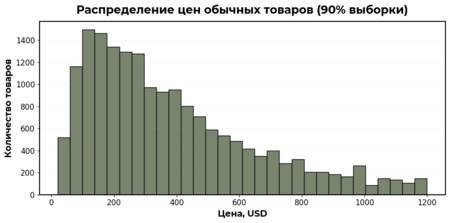 Выбросы в данном датасете являются нормальной ситуацией, так как рынок одежды включает товары разных ценовых категорий: от более доступных до люксовых. Чтобы наглядно объяснить это, далее я отдельно рассмотрю распределение цен для 90% обычных товаров и для 10% самых дорогих позиций, которые формируют выбросы.