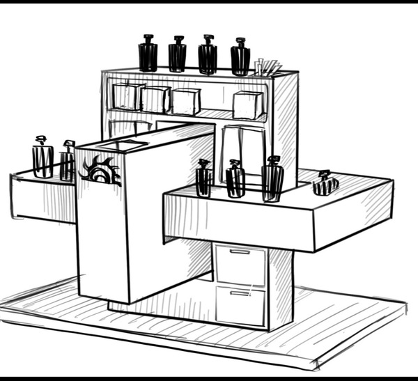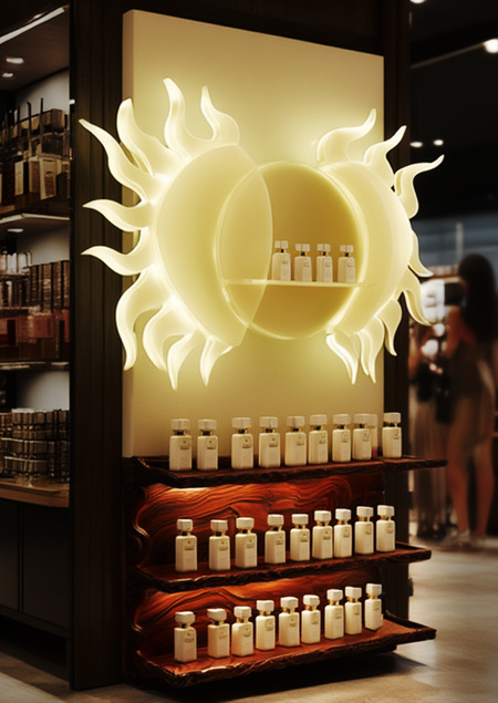 Стенд для бренда мексиканской парфюмерии — KIINHA. Расположен в косметических магазинах, как островной и приставной стенды. Цель объектов создать узнаваемый образ бренда, обратить внимание покупателя на продукт.