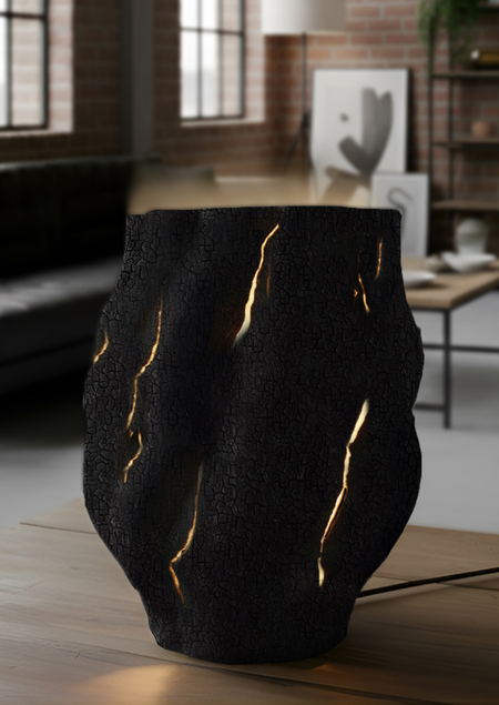 Серия уникальных декоративных светильников, визуально и тактильно имитирующих вулкан, потеки лавы, передающих контраст между монолитной, грубой формой вулканических камней, кратера и динамичной, живой текстурой лавы с трещинами