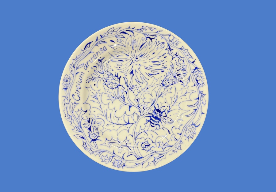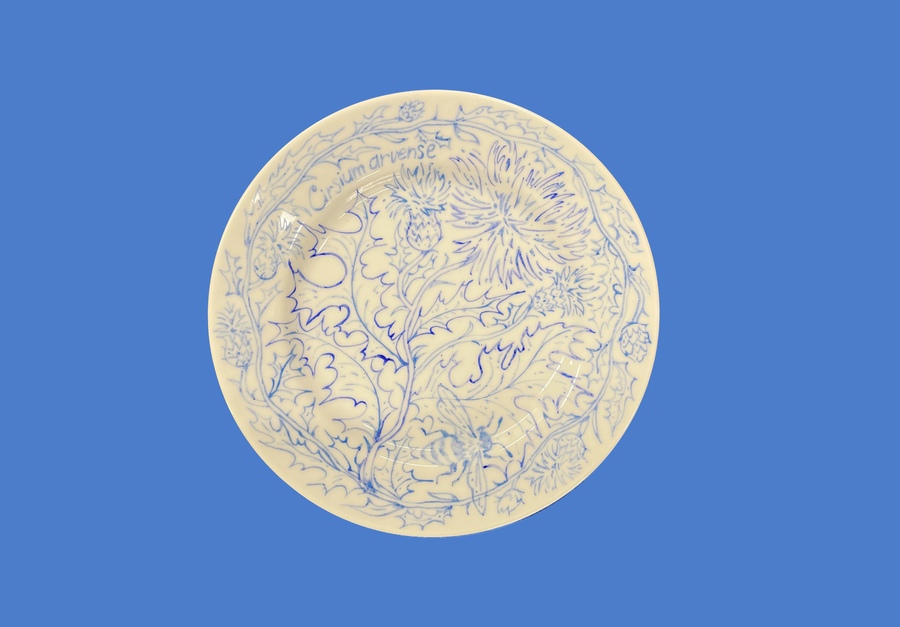 Фарфоровая тарелка надглазурной росписи с изображением растения и шмеля. Надпись на тарелке — название растения на латыни.