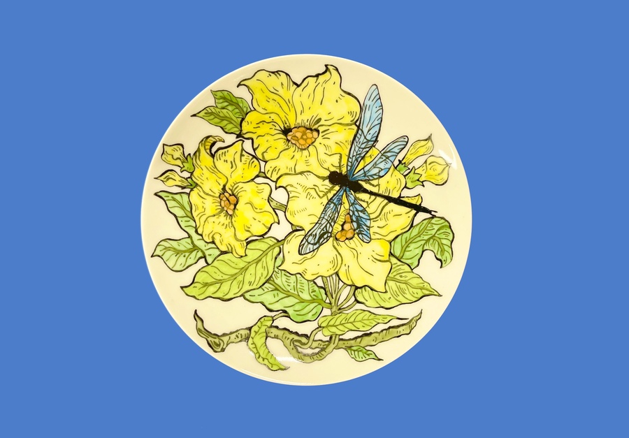 Фарфоровая тарелка надглазурной росписи с изображением желтых цветов и голубой стрекозы.