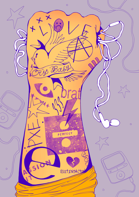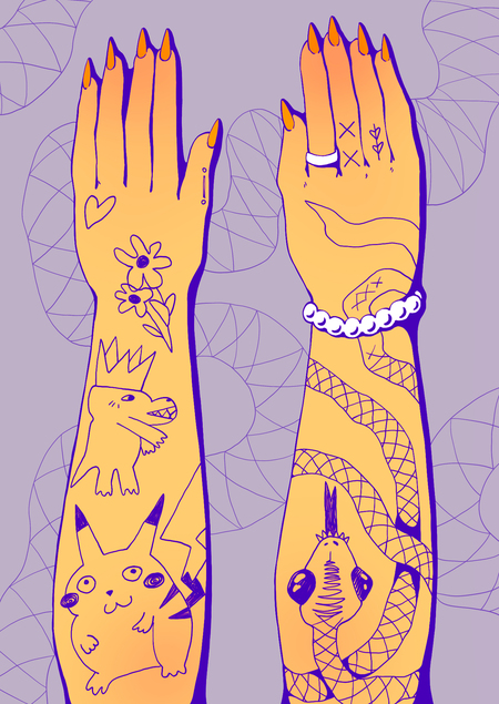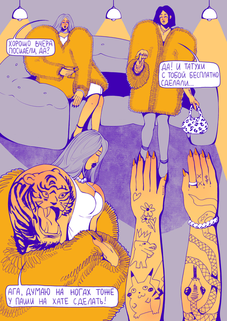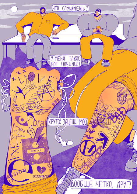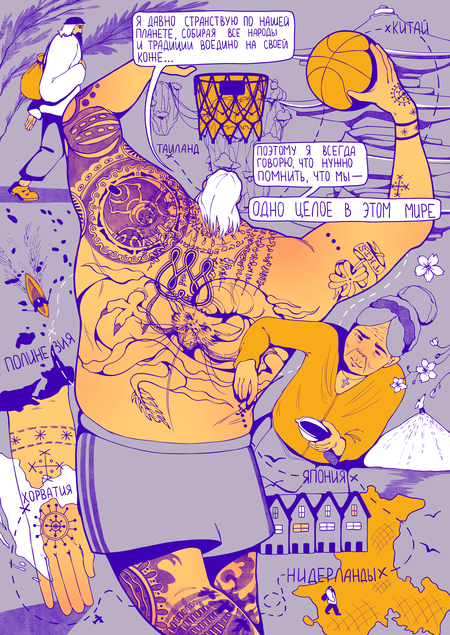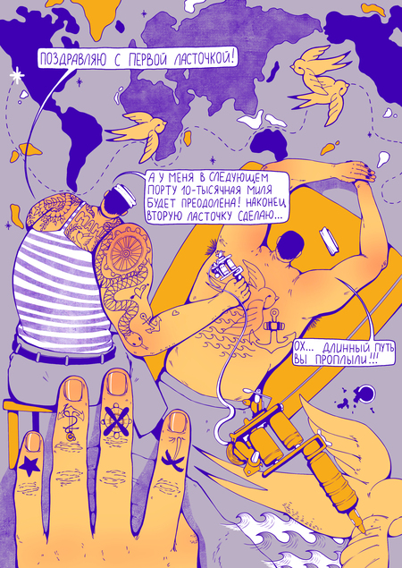 Плакаты-комиксы о том, что татуировки могут рассказывать не только о владельце, но и о самих себе как в прошлом и традиционном, так и в настоящем и вечном.