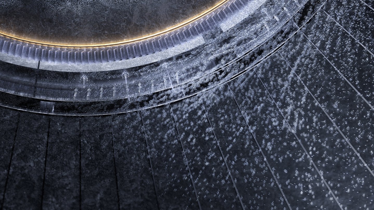 Одной из самых сложных в исполнении с точки зрения композитинга сцен является шот с падающими на лёд монетами. Кромки льда сделаны через voronoi fracture, а эффект внутренних трещин достигается не шейдером, а геометрией, помещённой внутрь. При этом важно соблюсти большую разницу в параметре IOR — индексе рефракции — чтобы разломы могли быть заметны в толще льда.