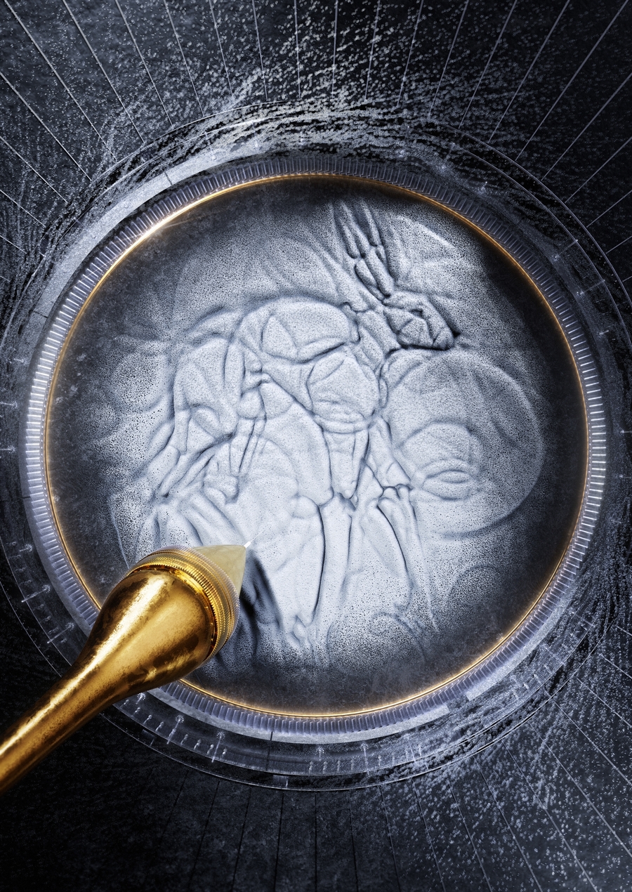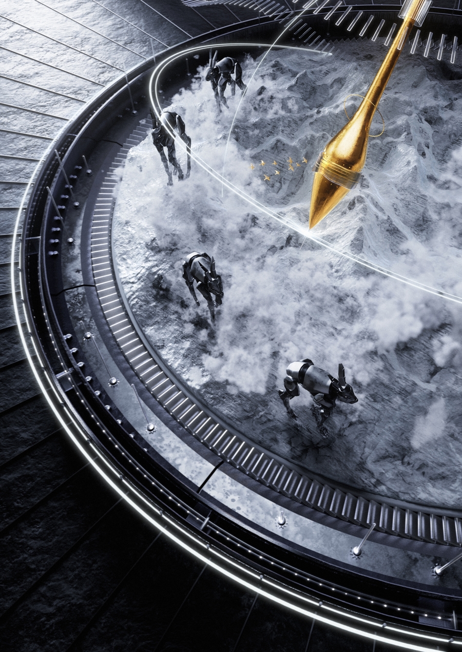 Для обложки была выбрана сцена с маятником, который выводит на снегу линии в форме зайца — главного символа и образа мира Whiteout. Эффект снежного полотна достигается за счёт использования matrix scatter. Это проприетарный метод рендер-движка Redshift, позволяющий отображать миллионы частиц без фактической нагрузки на программу. Он же используется и для визуализации потока частиц, который был сделан полностью инструментами новой Cinema 4D 2025. Новые типы эмиттеров и управления физическими параметрами симуляции помогают добиться результата, похожего на работу узкоспециализированных программ для частиц: X-Particles, Houdini.