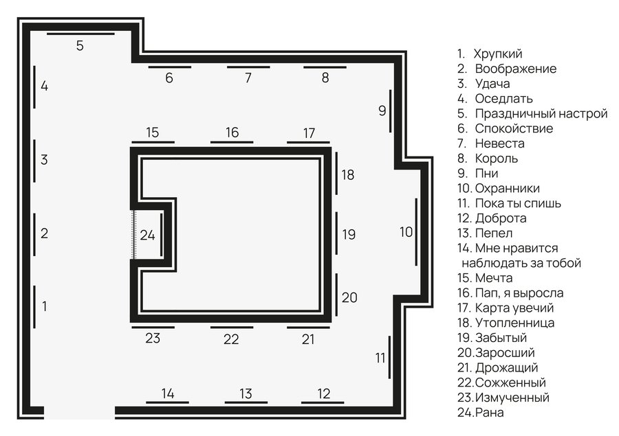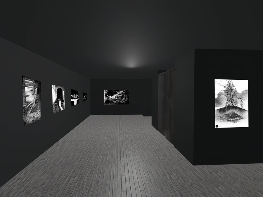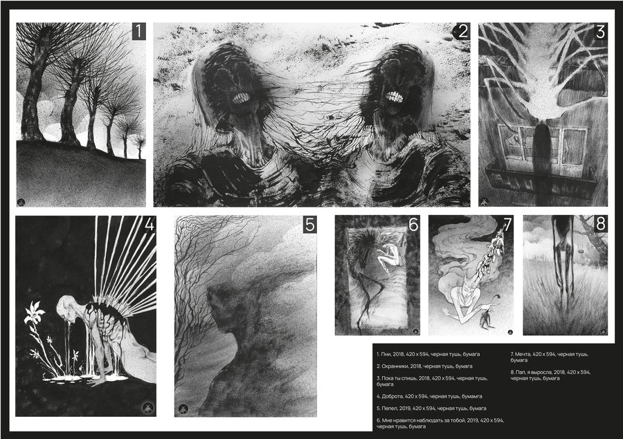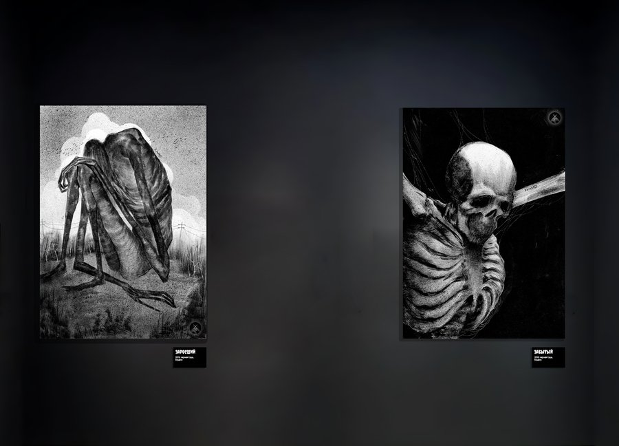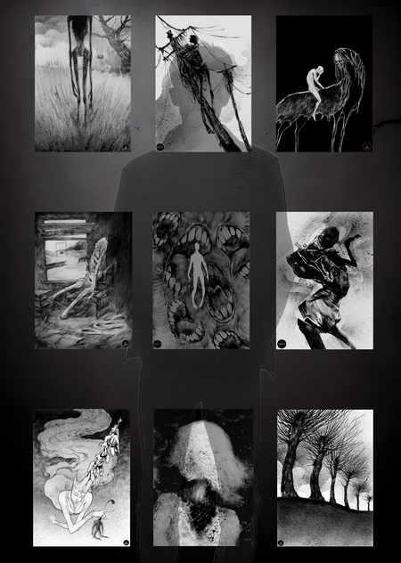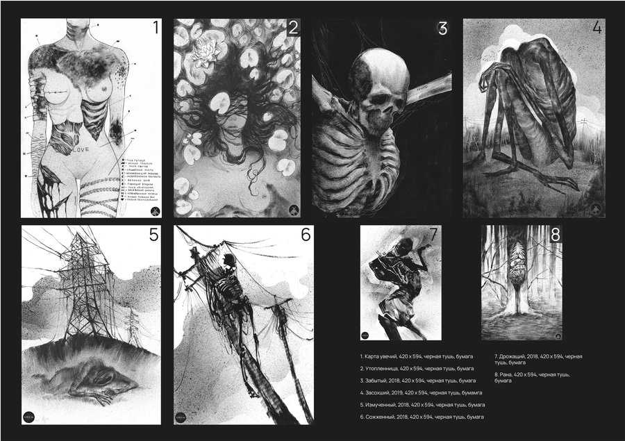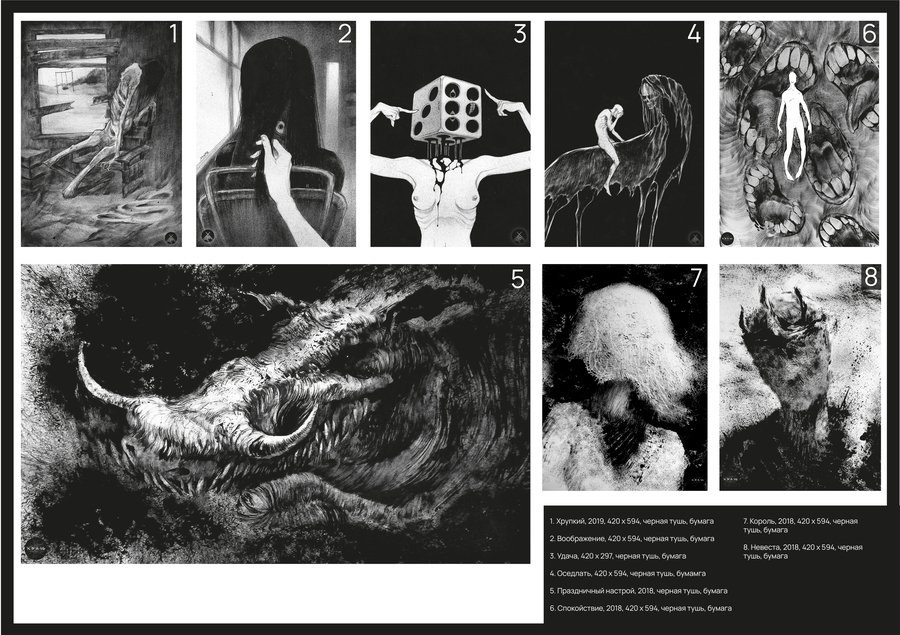 Работы отобраны за их способность через монохромную графику и хоррор‑эстетику — с резкими штрихами, «грязными» текстурами и искажёнными пропорциями — обнажать скрытые пласты психики: страхи, травмы и хрупкость существования. Также, присутствуют тематические серийные работы с образами женщины, антропоморфного существа, похожими визуальными метафорами.
