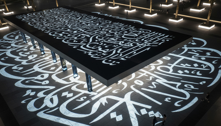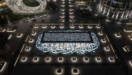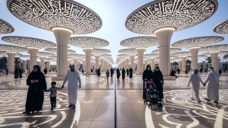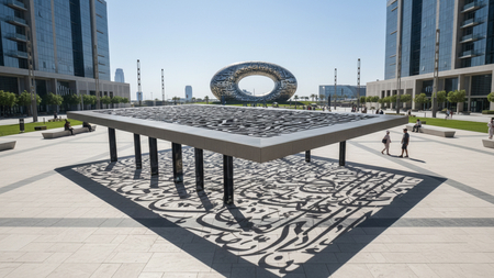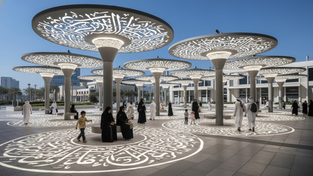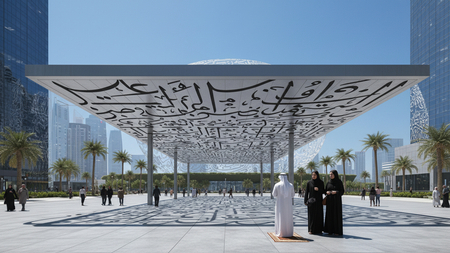 Длинная аллея под навесом формирует путь — ритмичный, протяжённый, созерцательный. Сквозь прорези арабской типографики солнечный свет проецирует тексты на землю, превращая движение человека в акт чтения. Вторая зона — пространство зонтиков, предлагает остановку, тень и тишину.