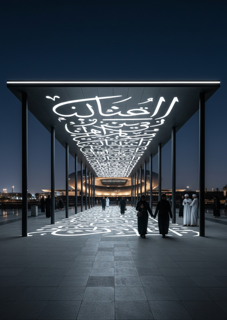 Аллея Света — это архитектурное пространство, в котором текст перестаёт быть поверхностью и становится средой. Проект превращает молитву и слово в свет и тень, делая язык частью телесного и пространственного опыта.