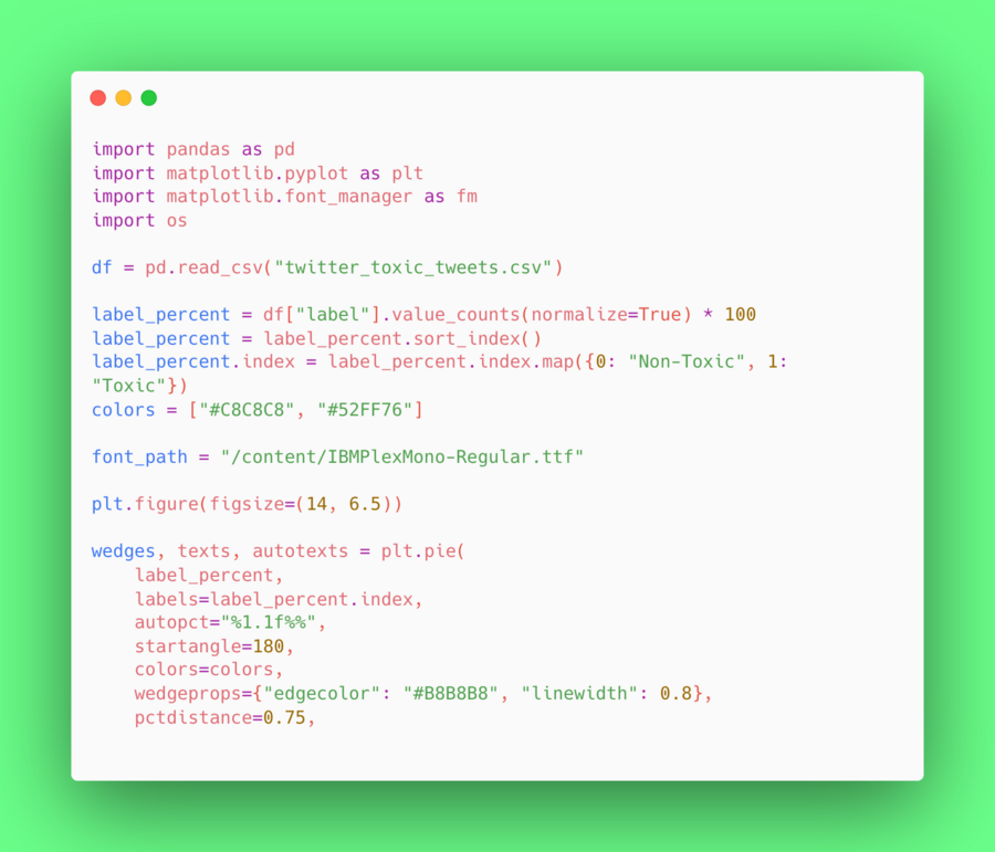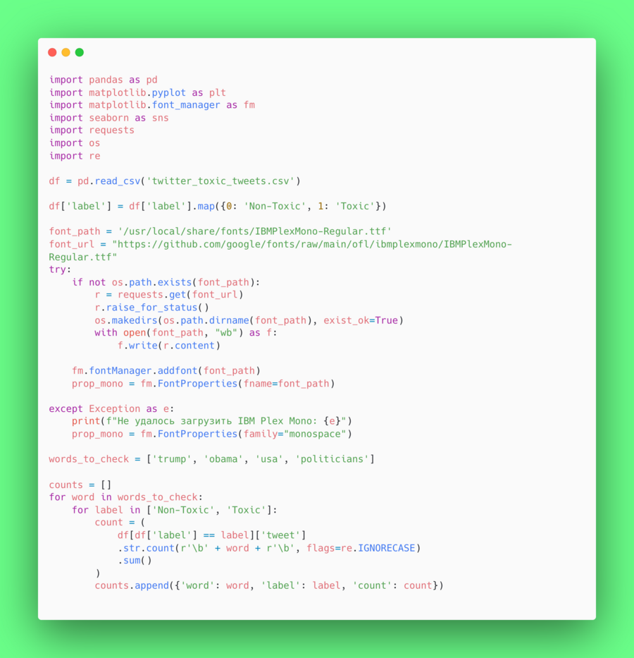 Так как я работала в среде Google Collab, то сначала загрузила датасет туда. А затем я импортировала данные с помощью библиотеки Pandas. Файл twitter_toxic_tweets.csv был преобразован в объект DataFrame, что позволило мне легко фильтровать твиты по их типу (токсичные/нетоксичные) и проводить дальнейшие операции