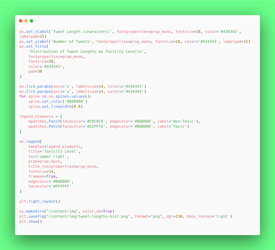 (1) Гистограммы были использованы для анализа распределения твитов по признаку токсичности. Этот тип графика позволяет наглядно оценить соотношение токсичных и нетоксичных сообщений в датасете.