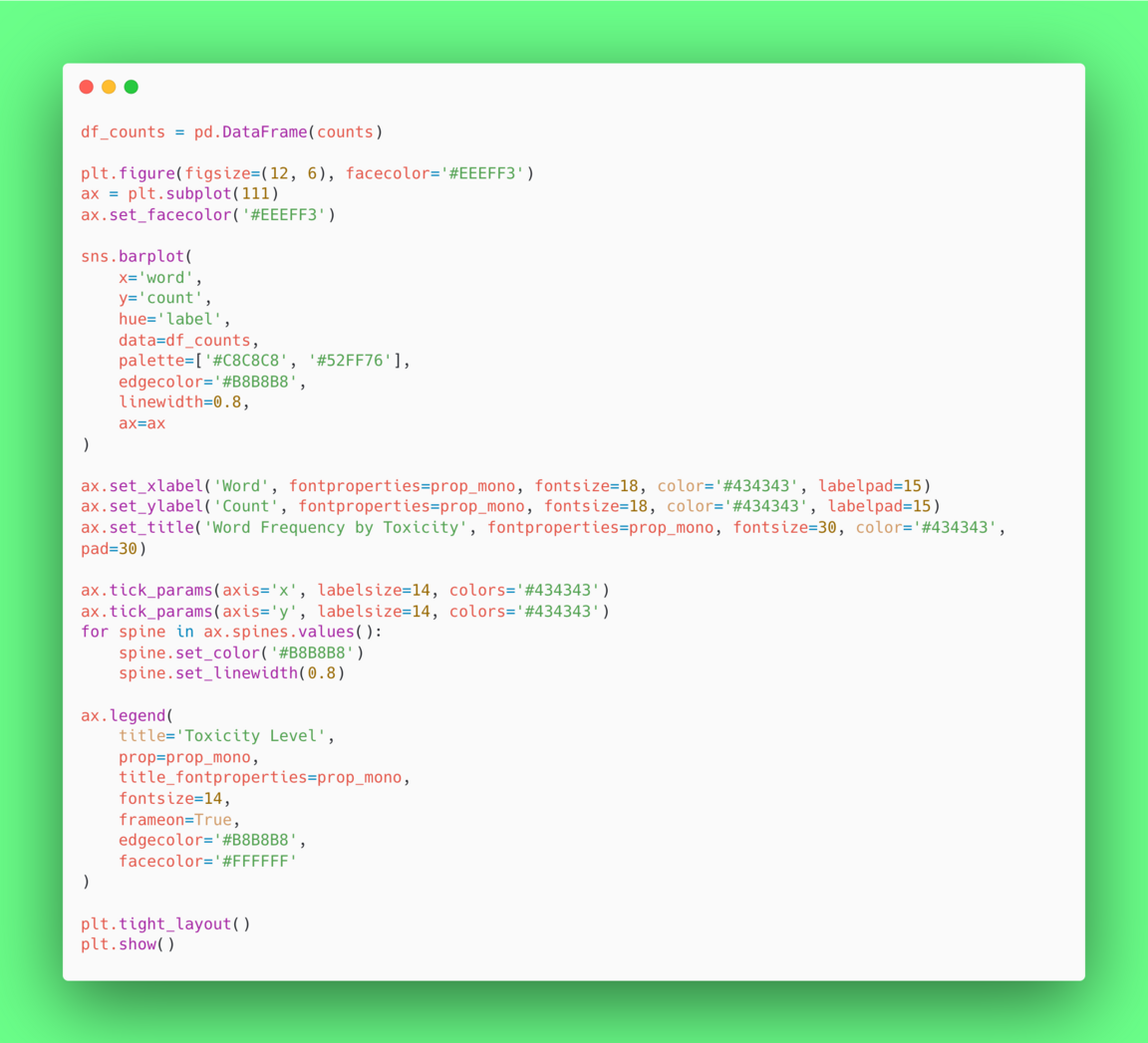 Барплот позволяет сравнивать частоту слов между категориями токсичных и нетоксичных твитов.