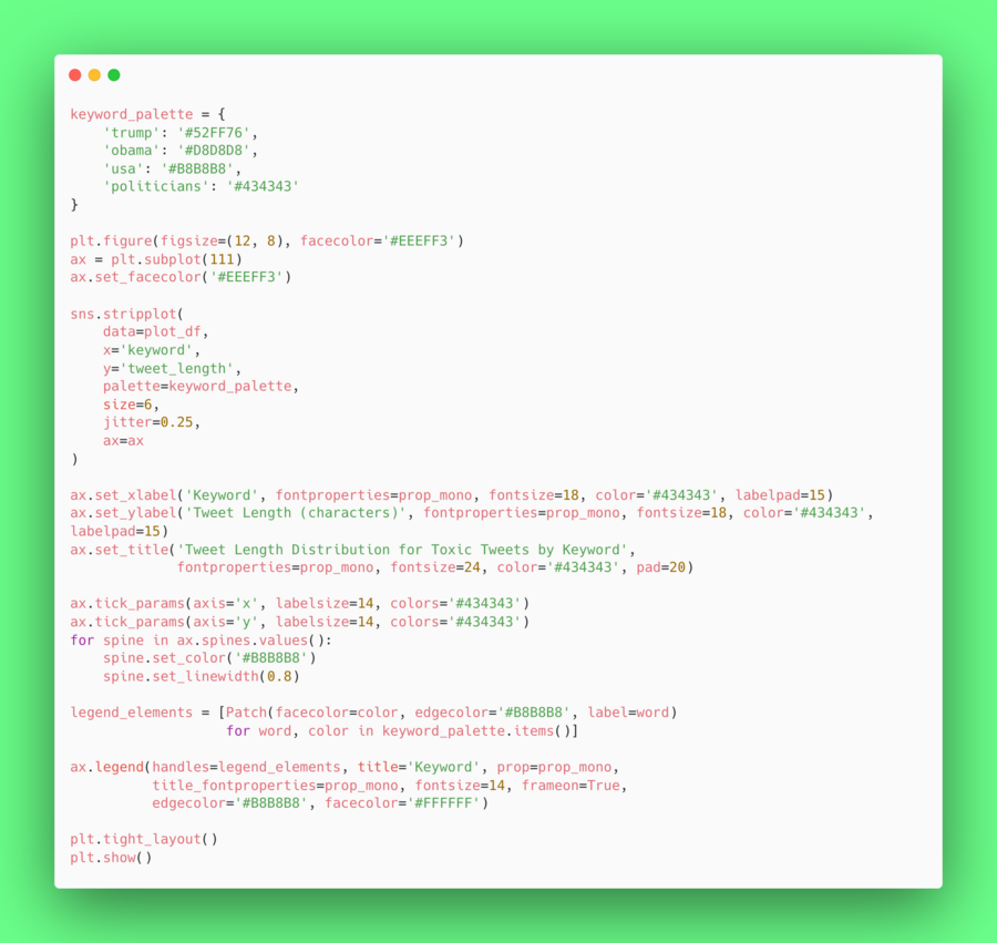 Длина твитов (Histogram и Stripplot) продемонстрировала, что большинство сообщений короткие, однако токсичные твиты могут быть длиннее, особенно с определенными ключевыми словами (trump, obama, usa, politicians). Этот анализ позволил выделить закономерности использования слов в токсичных твитах.