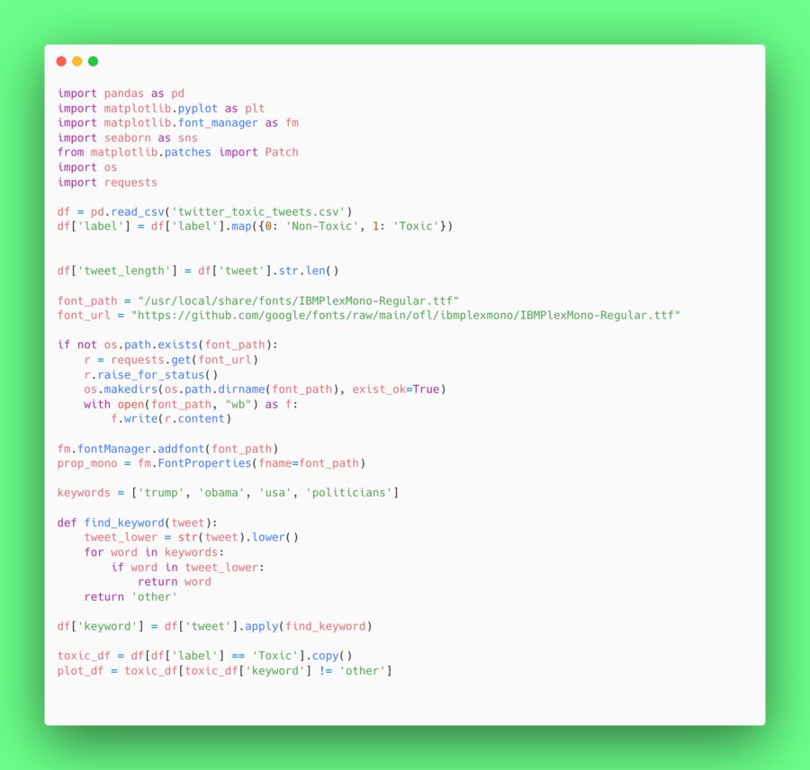 Далее я импортировала файл IBM Mono шрифта в Google Collab, создала объект шрифта FontProperties, указав путь к локальному файлу IBM Plex Mono (.ttf).