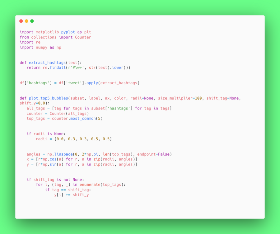 Bubble Chart демонстрирует относительную популярность ключевых хэштегов и различия в темах между двумя группами твитов.