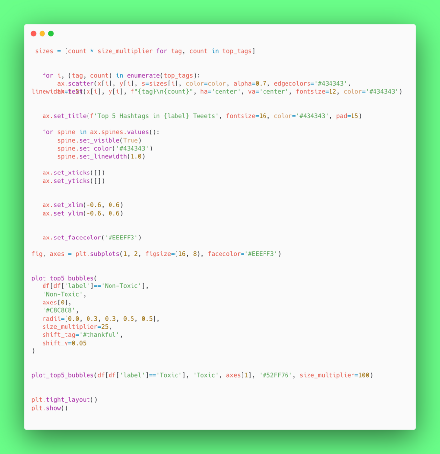 Популярные хэштеги (Bubble Chart) наглядно демонстрировали, что нетоксичные твиты используют позитивные или нейтральные хэштеги, а токсичные твиты содержат более спорные или эмоционально окрашенные хэштеги.