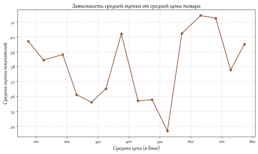 На этом графике я хотела проверить, влияет ли цена на оценку товара, что соответственно может повысить его популярность. Выяснилось, что наиболее высокие оценки не у самых дорогих вещей, как я ожидала увидеть, но у той одежды, цена которой выше средней.