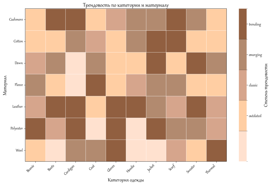 В последнюю очередь я захотела посмотреть, товары, сделанные из каких материалов, сейчас считаются трендовыми, а какие — устаревшими. С помощью данной таблицы можно заметить, что больше всего трендовых изделий сделаны из полиэстера и кожи, а больше всего устаревшей одежды из хлопка и флиса. Также можно сказать, что больше всего вещей, сделанных из кашемира относятся к недавно появившимся товарам, а к классике чаще всего относят одежду из кожи.
