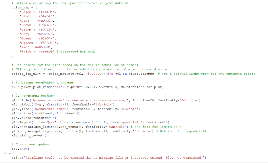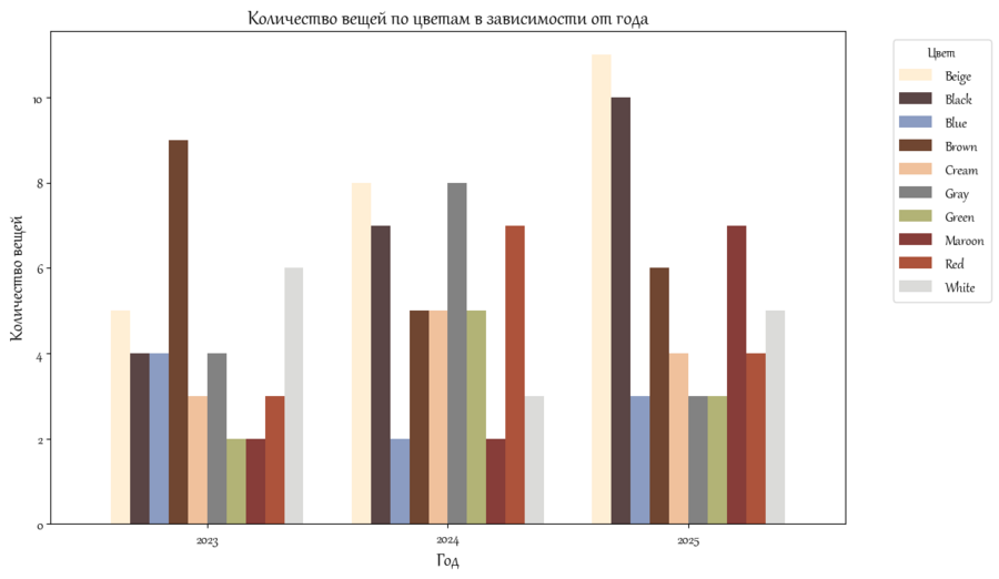 Также я хотела посмотреть, какие цвета в зимней одежде были популярны за последние 3 года. Так оказалось, что в 2023 году больше всего были популярны вещи коричневого цвета, в 2024 — бежевого и серого, а в 2025 — наиболее популярны вещи бежевого и черного цветов.