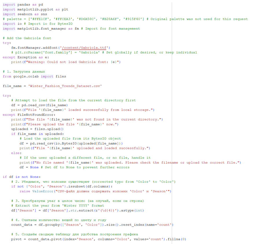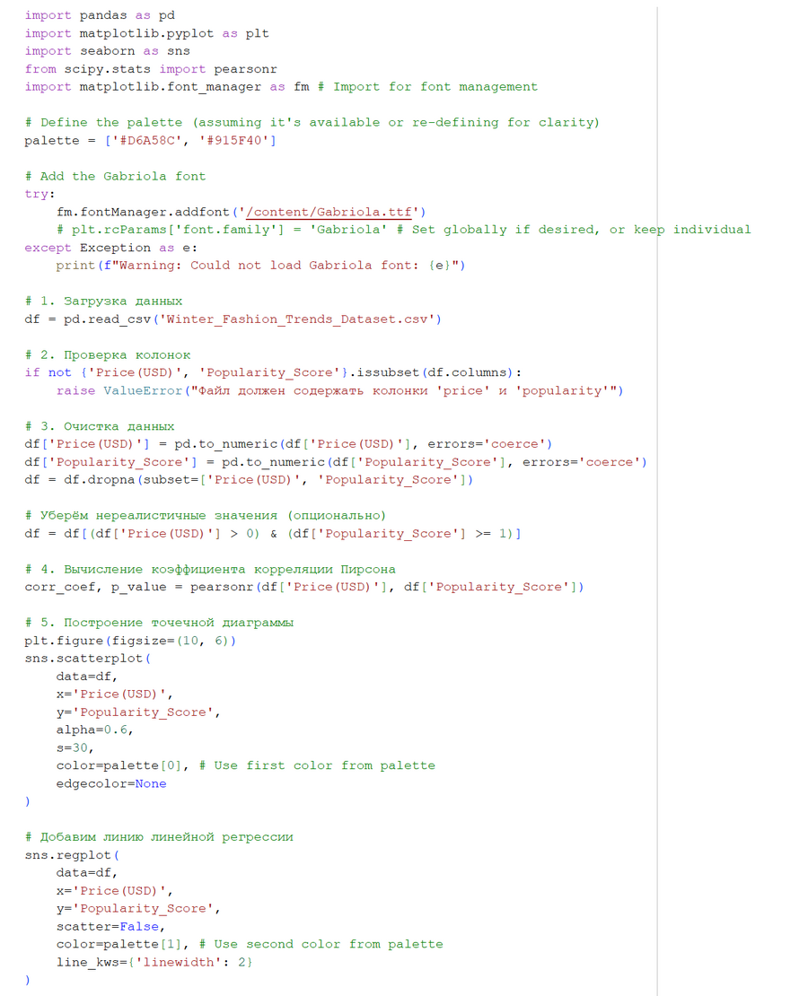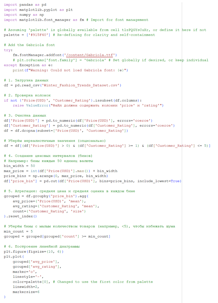 Из представленных графиков можно сделать вывод, что на рынках зимней одежды чаще всего встречаются такие элементы, как шарфы, перчатки и термобелье. Наиболее высокие оценки имеет одежда с ценой выше средней, но не максимальной. Также в 2025 году популярны вещи бежевого и черного цветов и больше всего трендовых вещей изготовлено из полиэстера и кожи. В заключение, я была частична права, когда строила гипотезу о трендах зимней одежды: мои идеи насчет цветов подтвердились, но предполагаемая взаимосвязь между ценой и покупательской оценкой оказалась неверна.