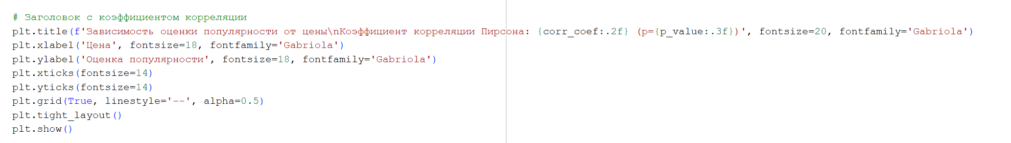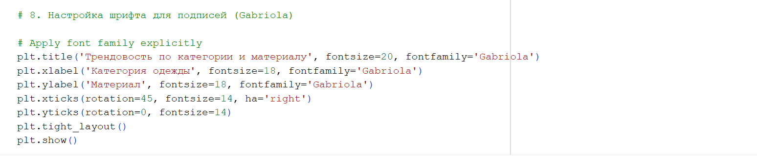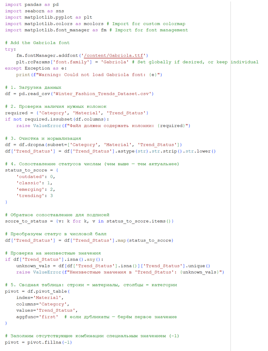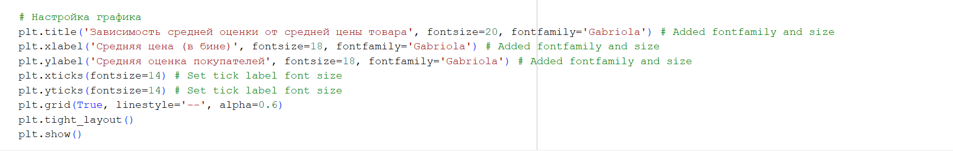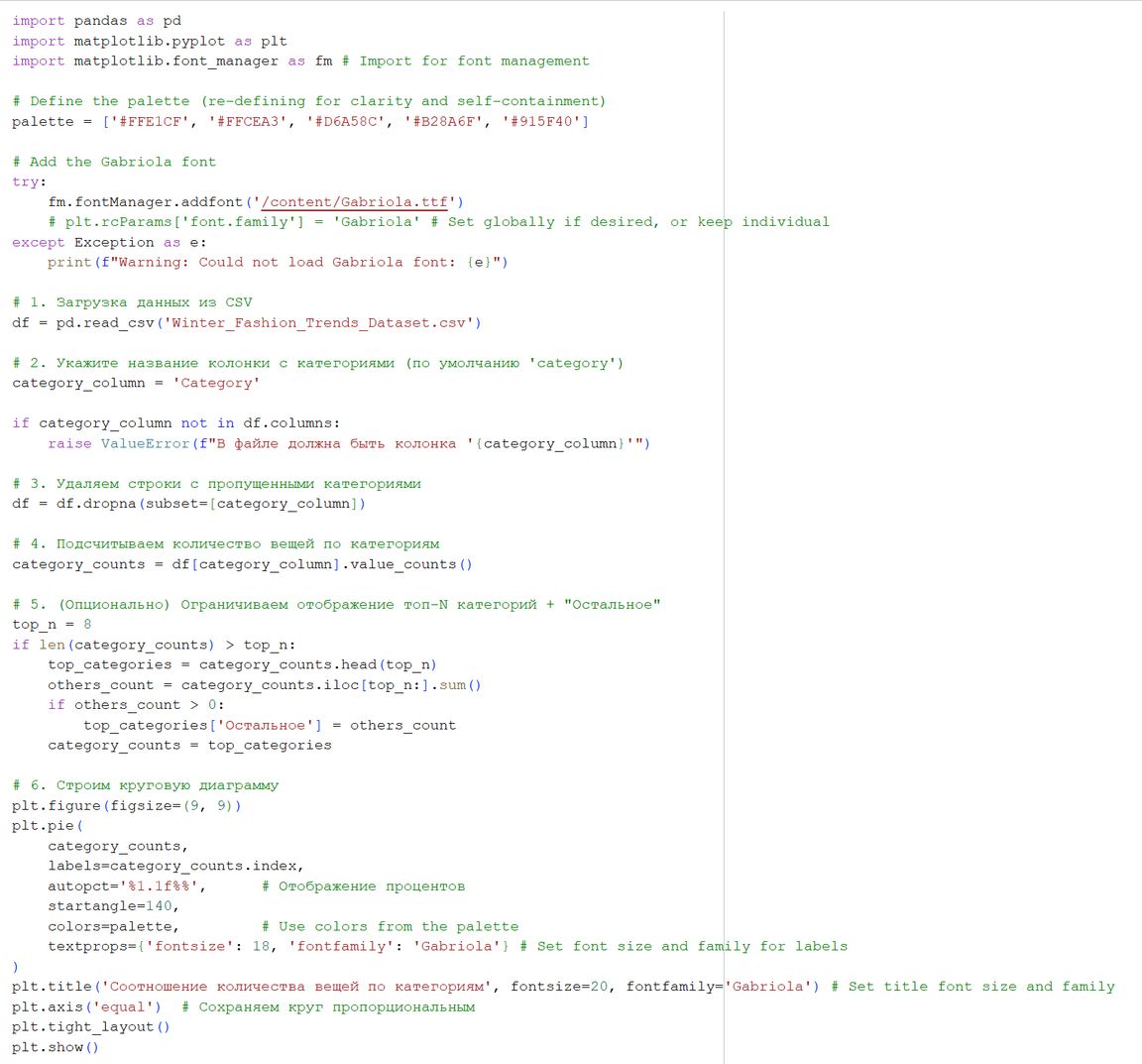 Из представленных графиков можно сделать вывод, что на рынках зимней одежды чаще всего встречаются такие элементы, как шарфы, перчатки и термобелье. Наиболее высокие оценки имеет одежда с ценой выше средней, но не максимальной. Также в 2025 году популярны вещи бежевого и черного цветов и больше всего трендовых вещей изготовлено из полиэстера и кожи. В заключение, я была частична права, когда строила гипотезу о трендах зимней одежды: мои идеи насчет цветов подтвердились, но предполагаемая взаимосвязь между ценой и покупательской оценкой оказалась неверна.