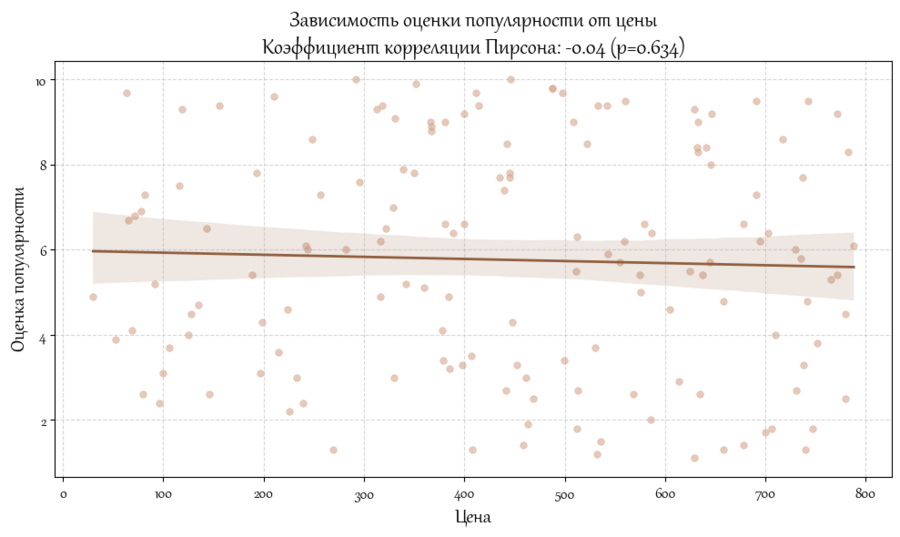 Также мне хотелось узнать, влияет ли цена на оценку популярности у товара. Оказалось, что цена почти не влияет на этот показатель, что видно из представленного графика (точки распределены более менее равномерно по всему графику).