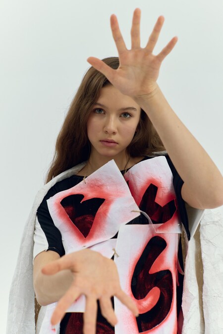 Футболка основана на принципе работы художника, его техниках и используемых инструментах. Бэнкси — мастер площадного искусства, которому характерны яркость, дерзость и ясность высказывания. Визуальный диалог создается с помощью нанесения краски из баллончика на подготовленный заранее трафарет, чтобы работать быстро и сохранять анонимность.