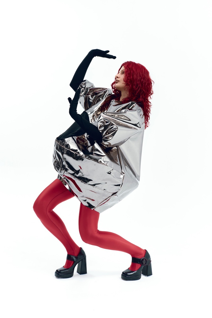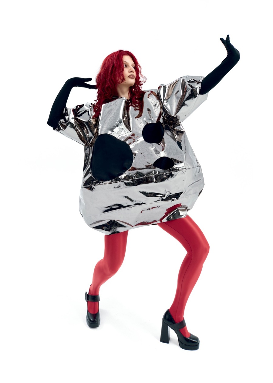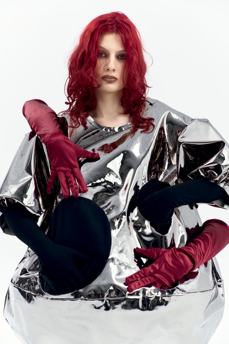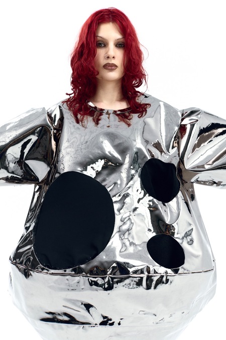 Футболка становится пространством, в котором меняется восприятие: формы туннелей и зеркальный материал создают эффект дезориентации. Изделие — это эксперимент с необычными ощущениями, подобными тем, что возникают при взаимодействии с инсталляциями Аниша Капура.