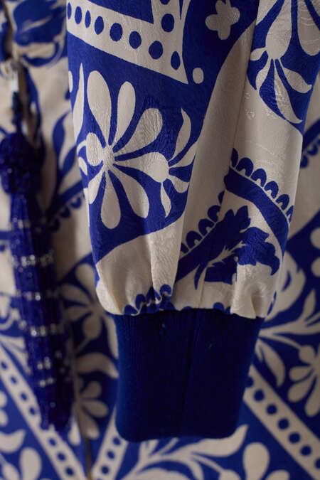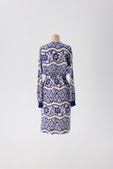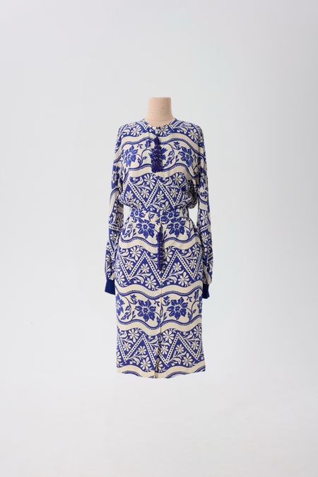 Платье довольно яркое само по себе, и для меня лично выделялось на фоне других в отобранных для съемки, поэтому я сразу решила его взять для изучения. Чем больше я его изучала, тем больше оно меня завлекало. Принт отдаленно напоминающий гжель, крупные брелки, трикотажные рукава, две молнии. Мне захотелось скорее даже для себя больше узнать об этом платье.