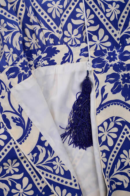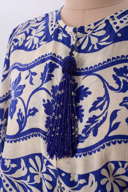 Это женское платье бело-синего цвета преимущественно из шелка, на ткань нанесен цветочный принт. Платье выполнено из натуральных тканей. В глаза также сразу бросаются крупные брелки на молнии, они синего цвета и выполнены из бисера.