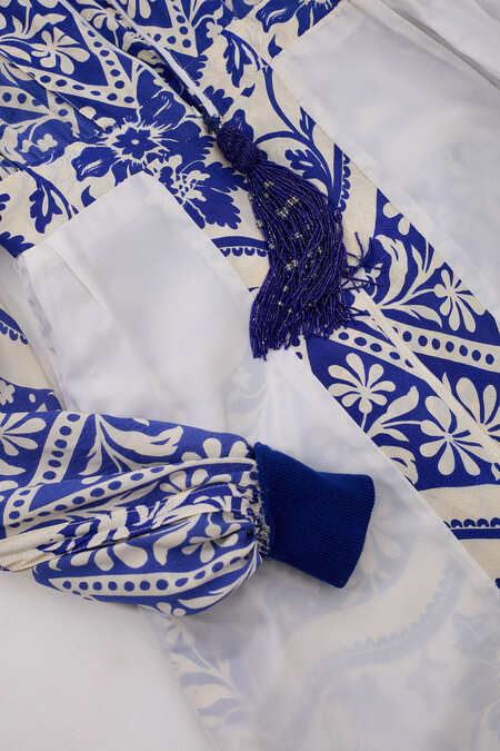 На платье не видны религиозные или иконографические отсылки, однако есть явные отсылки к традиции бело-синей росписи фарфора, предположительно китайской.