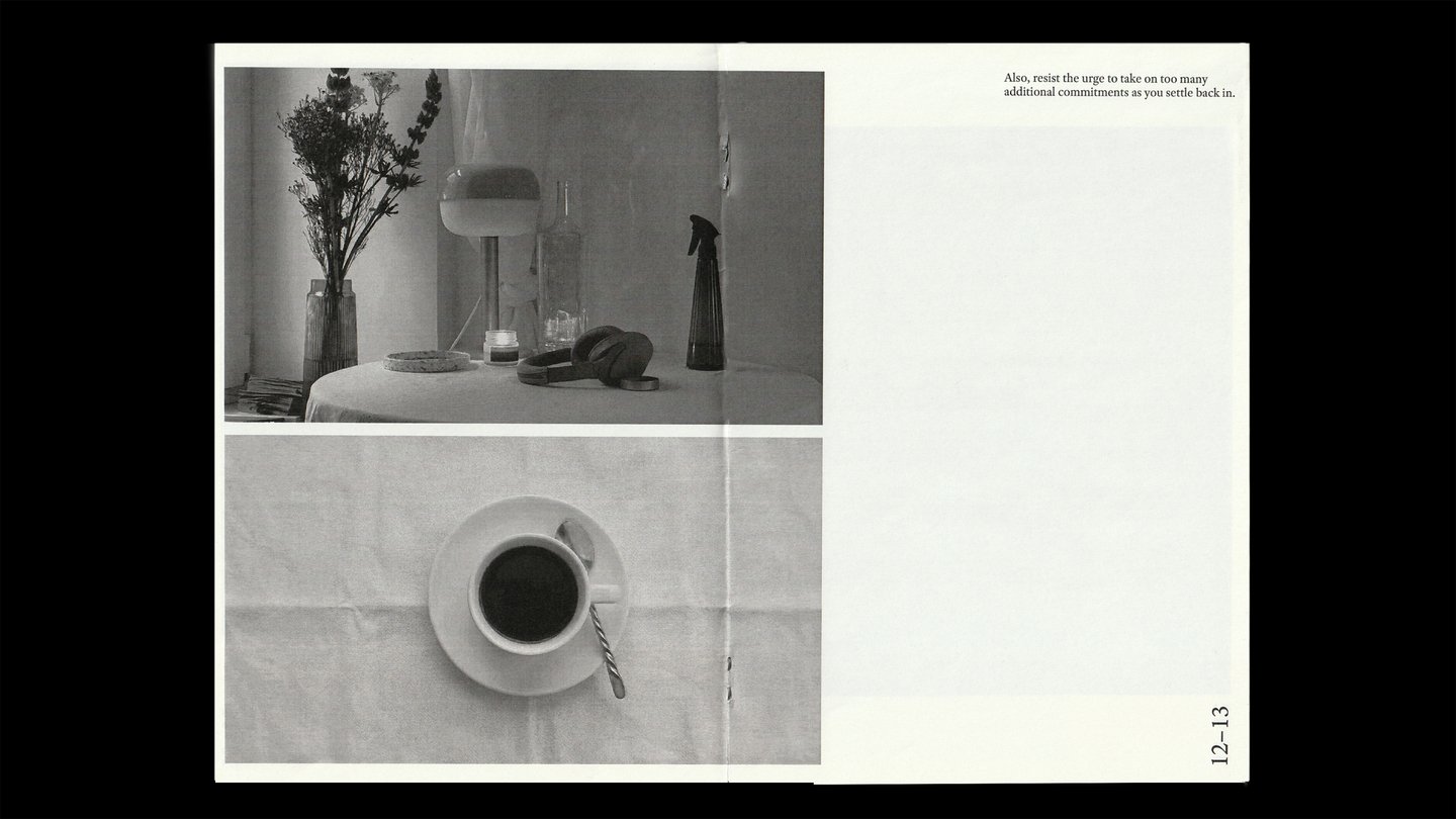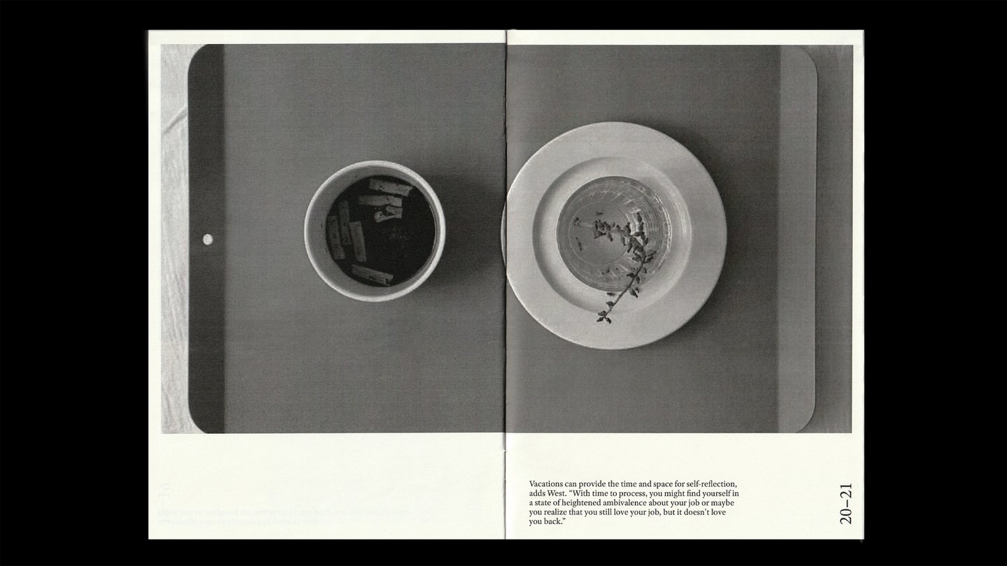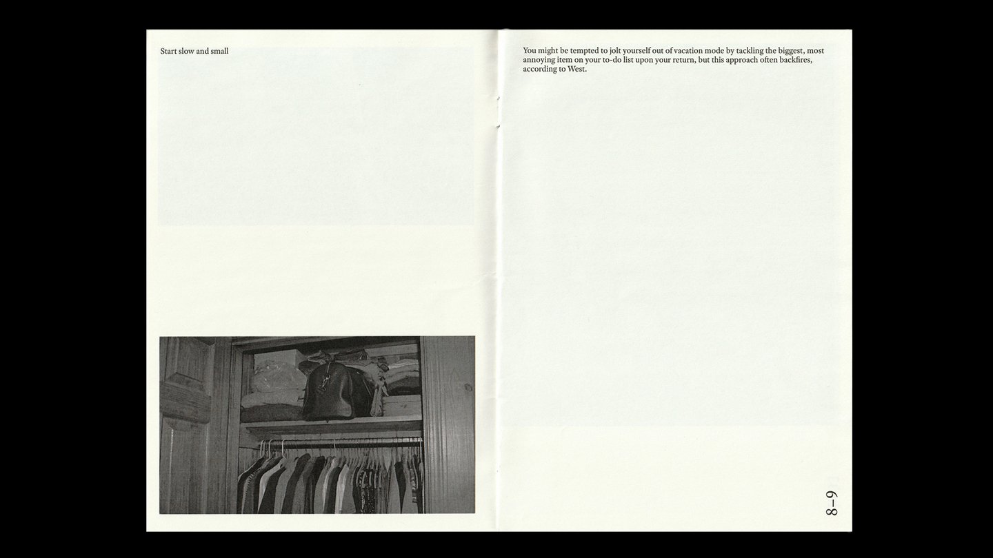 Зин включает в себя строчки из статьи том, как справиться с дофаминовой ямой и эмоциональным упадком после приезда из отпуска и параллельно показывает серию фото.