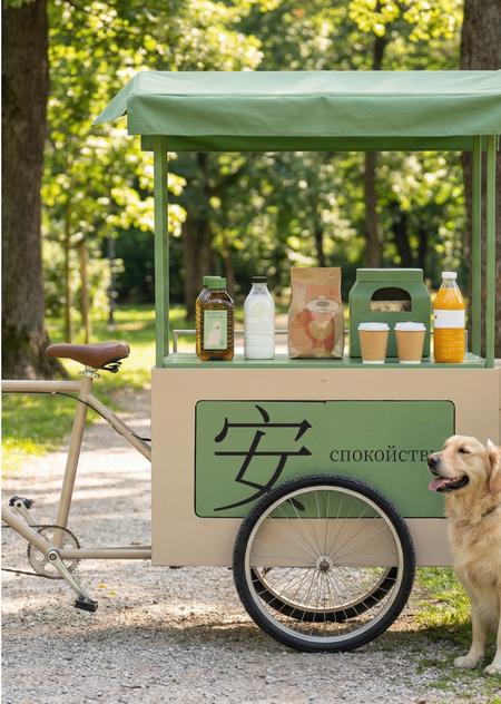 Велотележка специально разработана так, чтобы с легкостью перемещаться по паркам и снабжать владельцев и их питомцев компактными форматами кормов и лакомств.