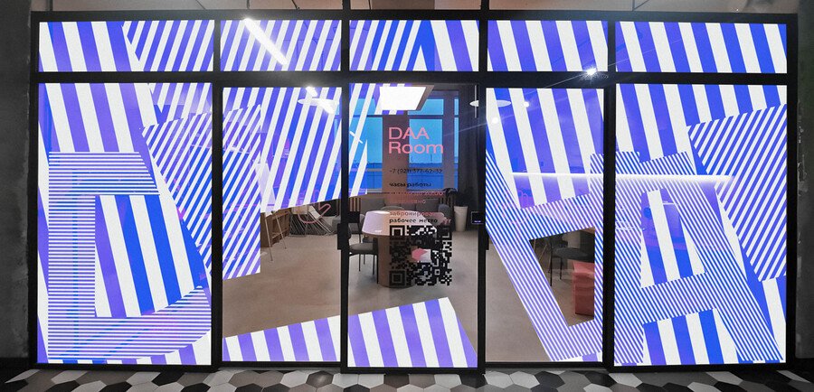 Здание DAA имеет особую архитектуру — угловатую и линейную. Множество линий пересекают друг друга, путают и создают новые рисунки. Именно эта особенность лежит в основе иллюстрации для витрины DAA Room.