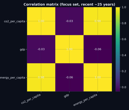 Рис. 3. Связь CO₂ на душу населения и GDP per capita (логарифмическая шкала по X) в последнем году. Рис. 4. Корреляционная матрица (Пирсон) для выбранных метрик за последние годы.