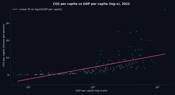 fig, ax = plt.subplots (figsize=(11, 6)) ax.scatter (sc[«gdp_per_capita»], sc[«co2_per_capita»], s=14, alpha=0.25, color=ACC1) ax.set_xscale («log») xs = np.logspace (np.log10(sc[«gdp_per_capita»].min ()), np.log10(sc[«gdp_per_capita»].max ()), 200) ys = a + b * np.log10(xs) ax.plot (xs, ys, linewidth=2.0, color=ACC2, label="Linear fit on log10(GDP per capita)») ax.set_title (f"CO2 per capita vs GDP per capita (log-x), {last_year_gdp}») ax.set_xlabel («GDP per capita (log scale)») ax.set_ylabel («CO2 per capita (tonnes per person)») prettify (ax) ax.legend (frameon=False) fig.tight_layout () fig.savefig (FIG_DIR / «fig3_scatter_gdp_co2pc.png», dpi=200) plt.close (fig)