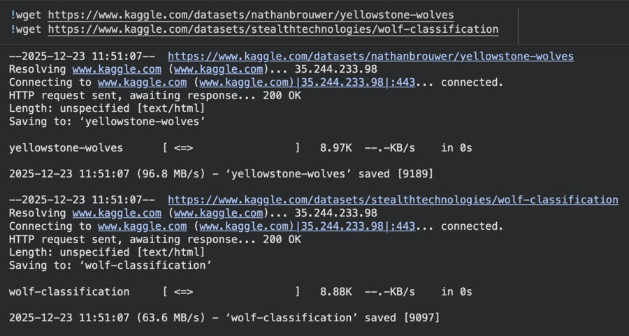 Начальным этапом работы стала загрузка данных. Я импортировала структурированные датасеты в формате CSV, полученные с платформы Kaggle, которые легли в основу количественного анализа. Параллельно для обеспечения полноты информации я загрузила и обработала табличные данные, собранные с общедоступных страниц Wikipedia, посвященных видам волков, их ареалам и популяциям.
