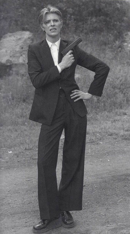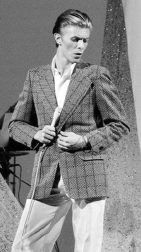 Дэвида часто можно было увидеть в обтягивающих комбинезонах Они часто были с преувеличенными плечами, асимметричными разрезами или невероятными принтами, подчеркивали его телосложение, но делали это в совершенно нетрадиционной для мужчины манере. Они больше напоминали театральные наряды, чем обычную одежду. В то время обтягивающие вещи на мужчине были настоящей провокацией.
