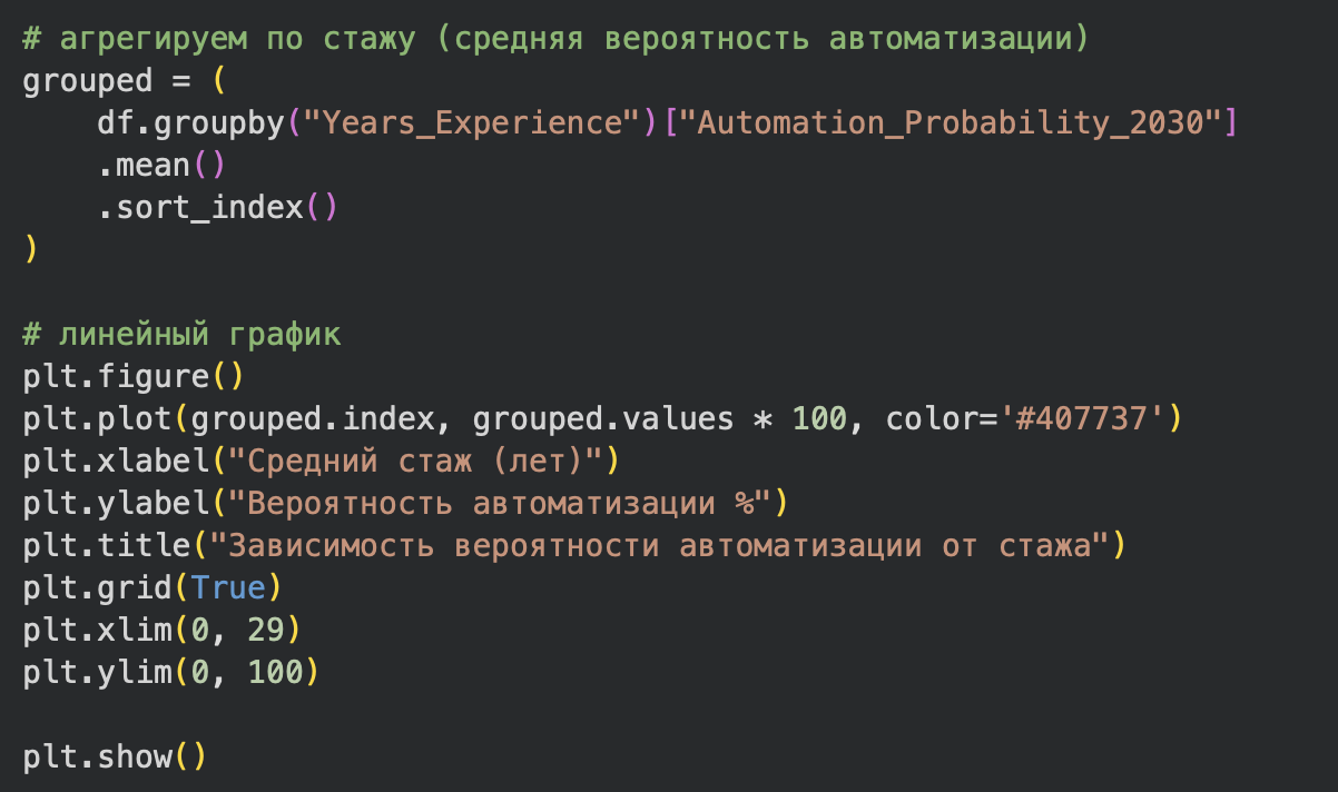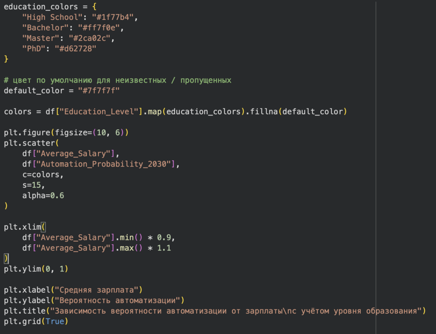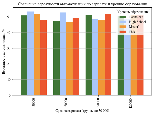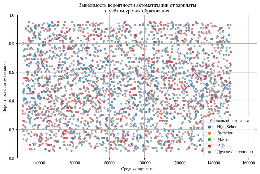 В данном анализе был использован датасет с сайта kaggle.com, под названием «AI Impact on Jobs 2030», этот датасет содержит в себе данные опрашиваемых о среднегодовой зарплате за работу (доллары США), обычно требуемый опыт работы, требуемый самый высокий общий уровень образования, показатели того, насколько работа взаимодействует с инструментами ИИ и предполагаемая вероятность того, что работа будет автоматизирована к 2030 году.