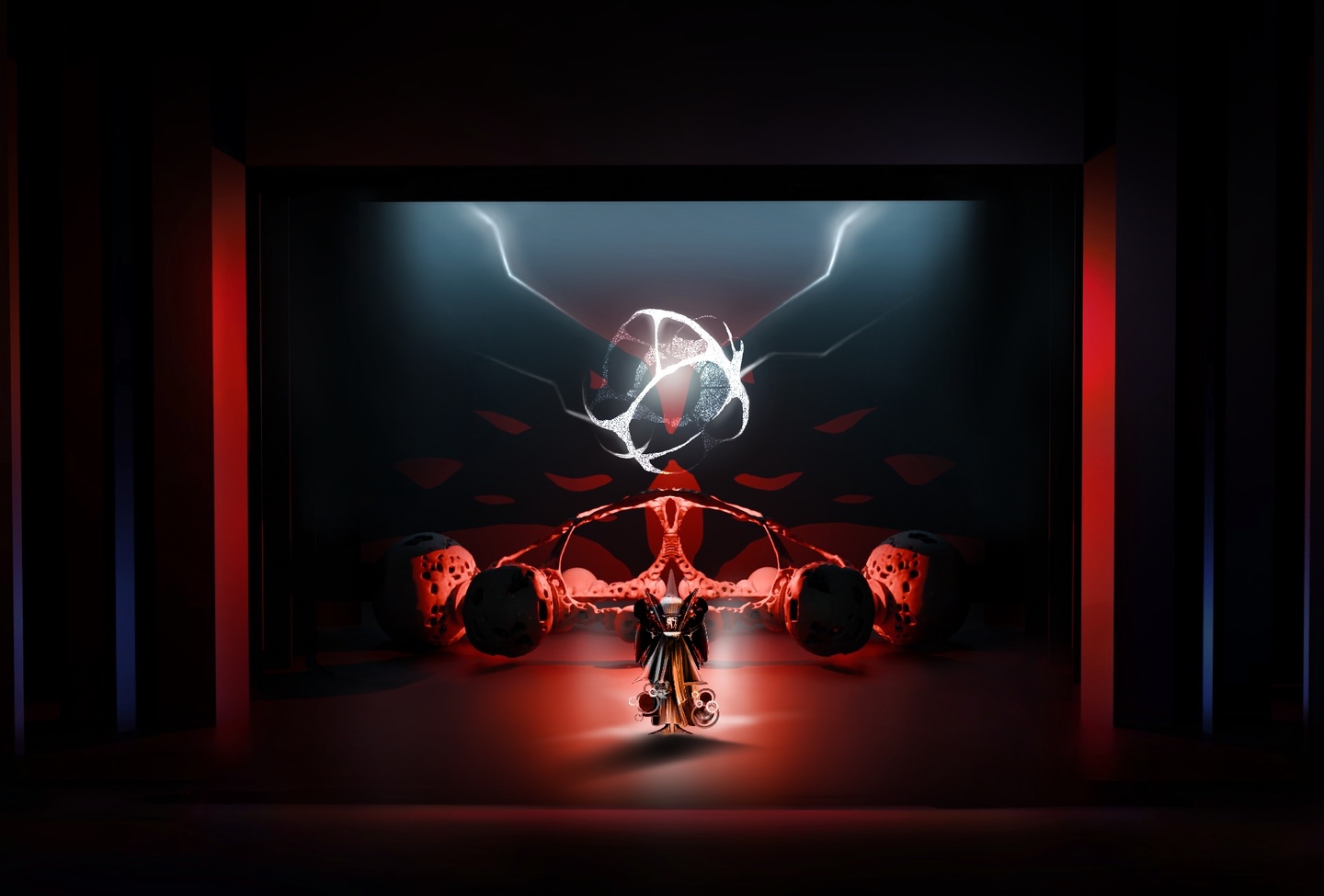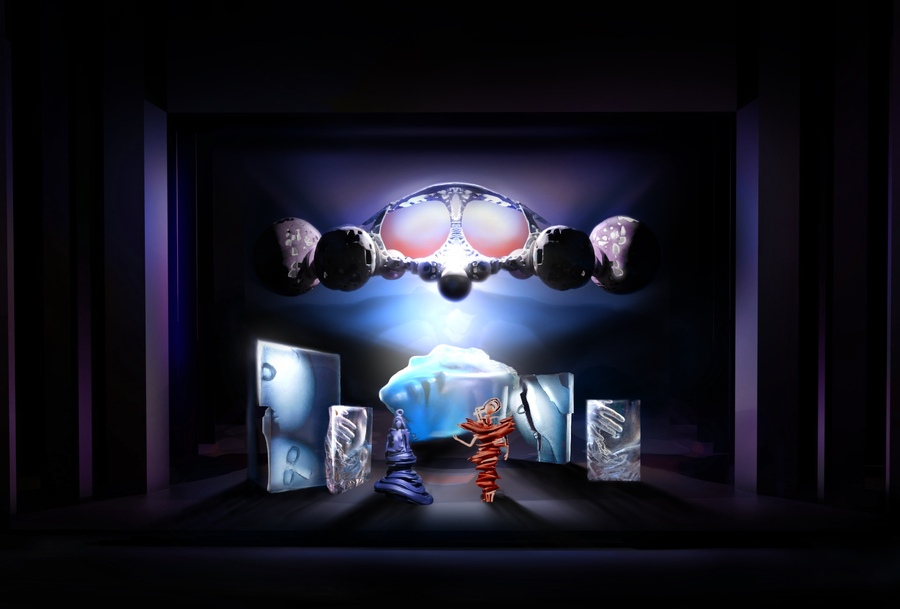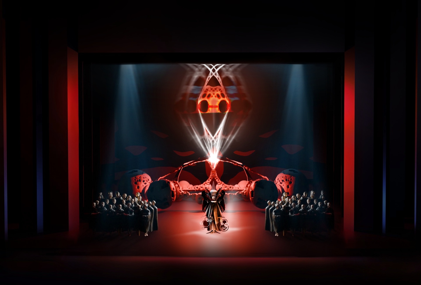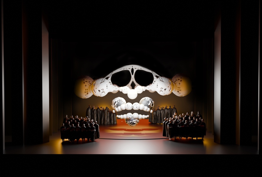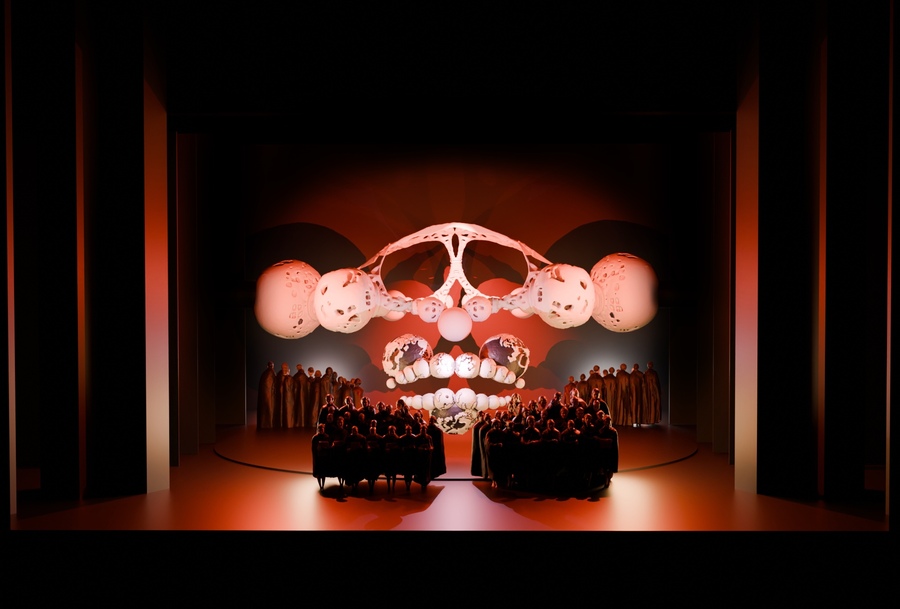 Пространство сцены — замкнутая структура, воспринимаемая как дворец и одновременно как космическое тело.