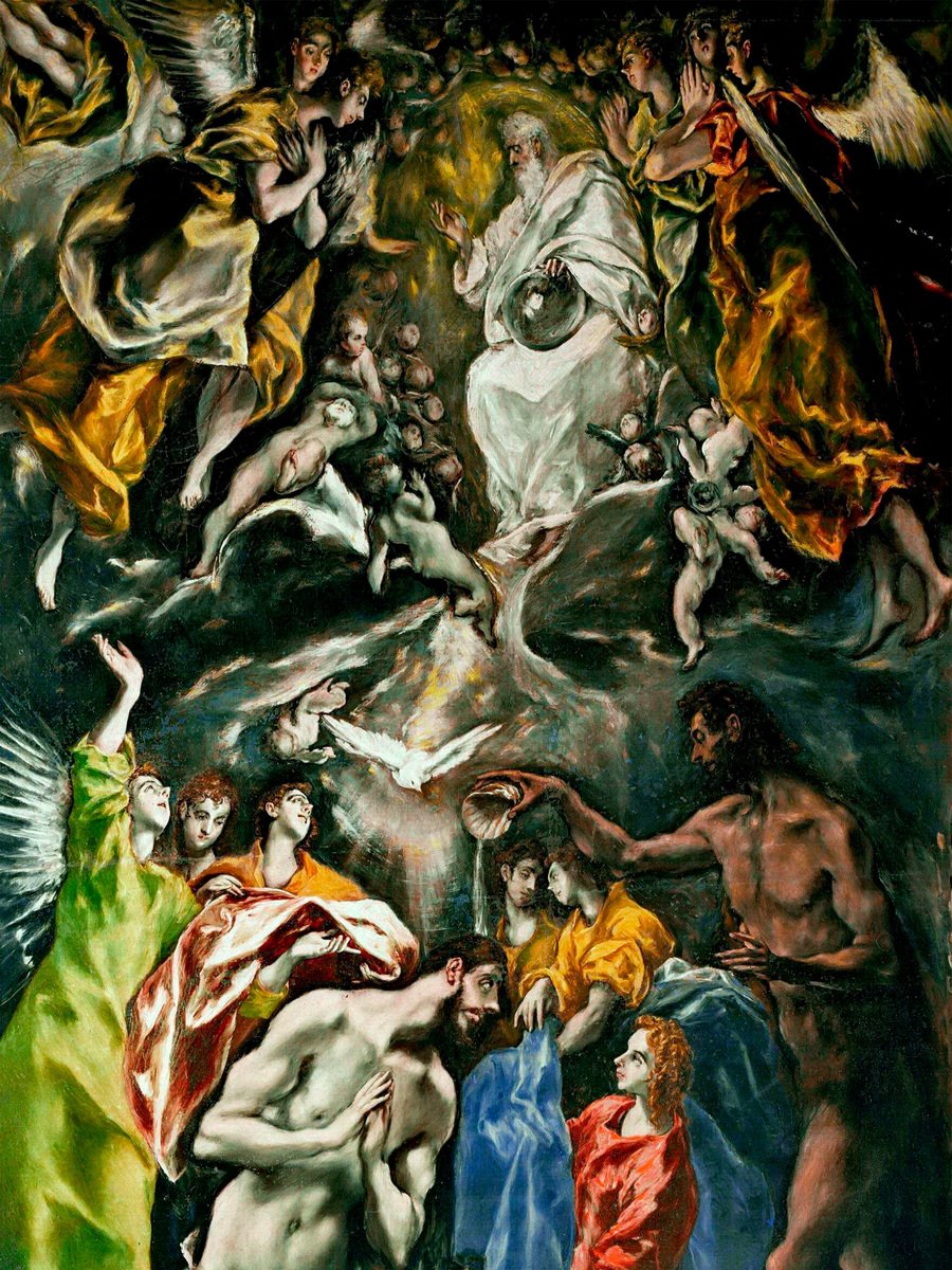 Для того, чтобы определить роль композиции в библейских сюжетах Эль Греко, где фигурирует Христос, я выбрала разные по наполнению картины — «Христос на Елеонской горе» (Моление о чаше) и «Крещение Христа». В первом случае благодаря безлюдному, пустующему пространству хорошо считывается «диалог» между героями, а также сокровенность момента молитвы: он настолько эмоциональный и значимый, что весь мир словно замирает. В случае «Крещения Христа» композиция как раз перенасыщена, таким образом воплощая множество микросюжетов внутри основного, и, что немаловажно, создавая ощущение торжественности и значимости происходящих событий.
