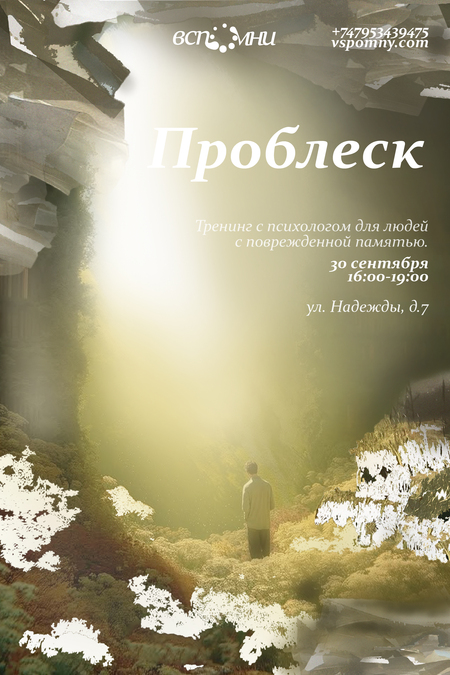 проблеск — индивидуальный тренинг с психологом, помогающий людям с нарушениями памяти вновь обрести опору. Это метафора внутреннего света — той яркой вспышки, что никогда не гаснет в глубине души и продолжает отражать уникальность вашей личности.