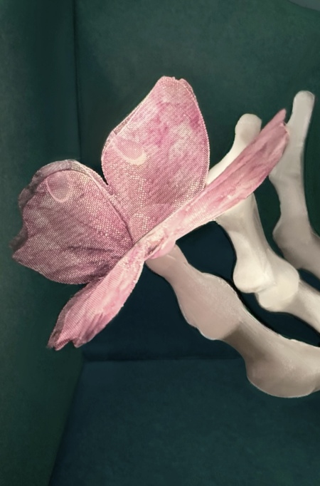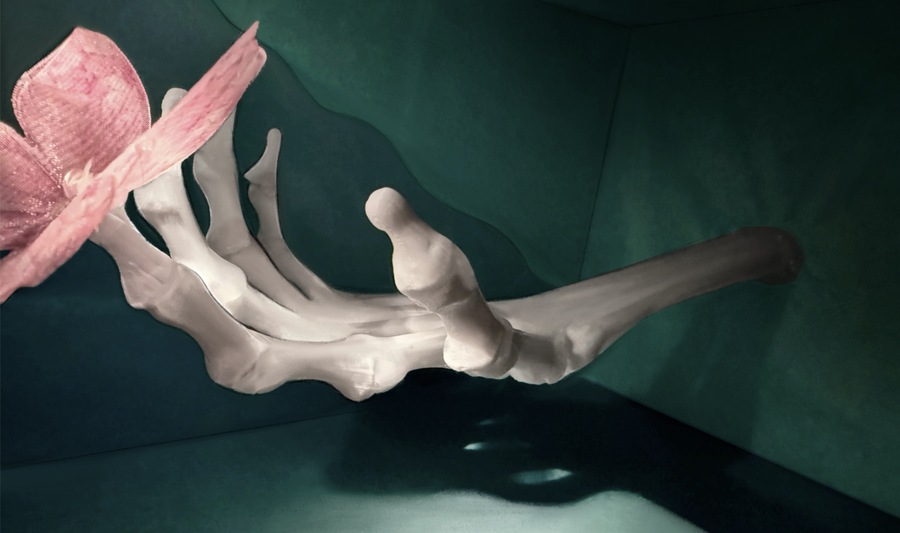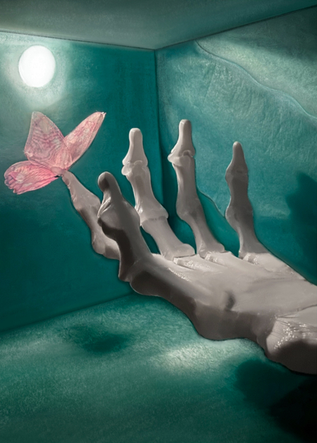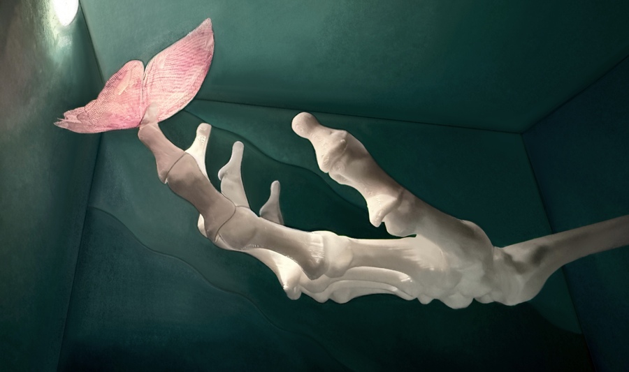 Витрина основана на идеях Сандры Яги о связи человека и природы. Белая рука скелета, протянутая к бабочке, воплощает встречу двух миров. В этом соприкосновении рождается тихий диалог и поэтичное напряжение между вечным и мгновенным.