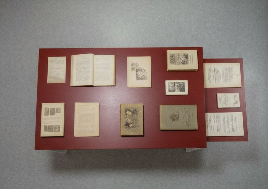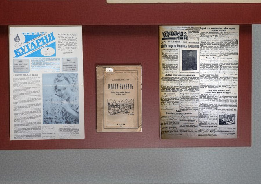 Зал, с которого начинается знакомство посетителя с выставкой. Зал посвящен истории языка, в нем представлены архивные записи, письма, газеты и учебники на марийском языке