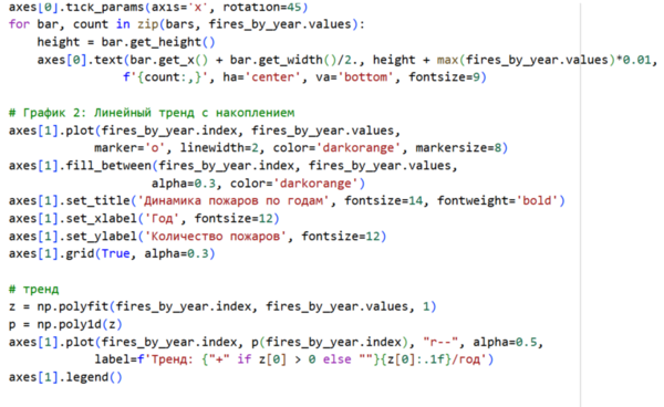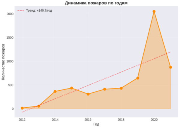 Линейный график тренда — показал общую динамику изменения количества пожаров по годам с выделением тенденции