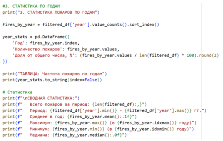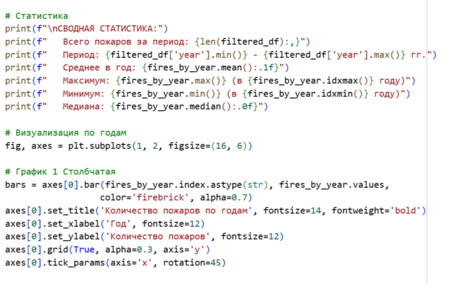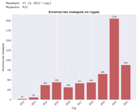 Столбчатая диаграмма по годам — наглядно продемонстрировала пиковые и минимальные периоды пожарной активности