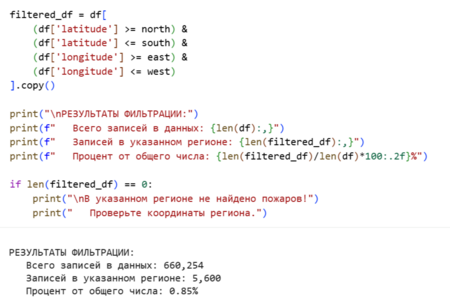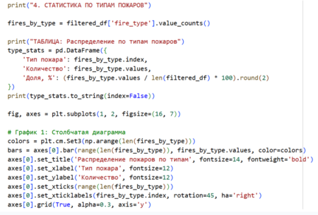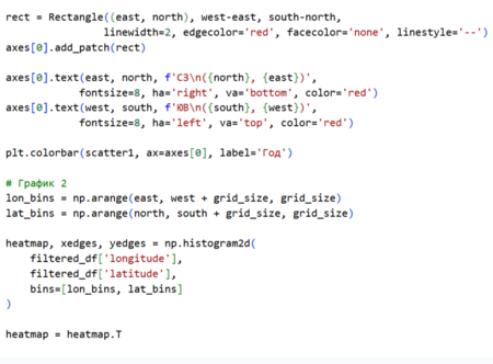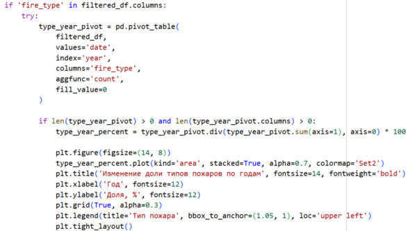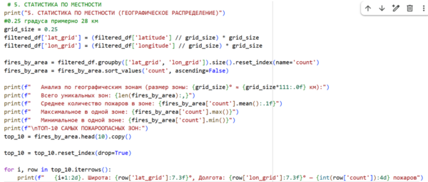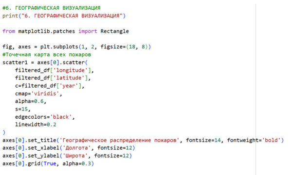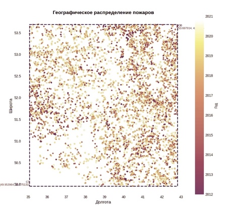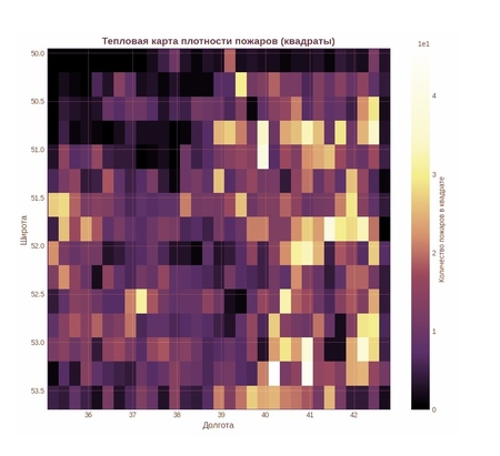 Для анализа локаций пожаров и их объёма построила линейные графики, отображающие динамику количества пожаров по годам с выделением тренда, и точечные диаграммы, показывающие географическое распределение каждого возгорания на карте региона. Также были созданы тепловые карты плотности, визуализирующие зоны наибольшей концентрации пожаров, и квадратные карты интенсивности, где цветом обозначена частота возгораний в каждой географической зоне.